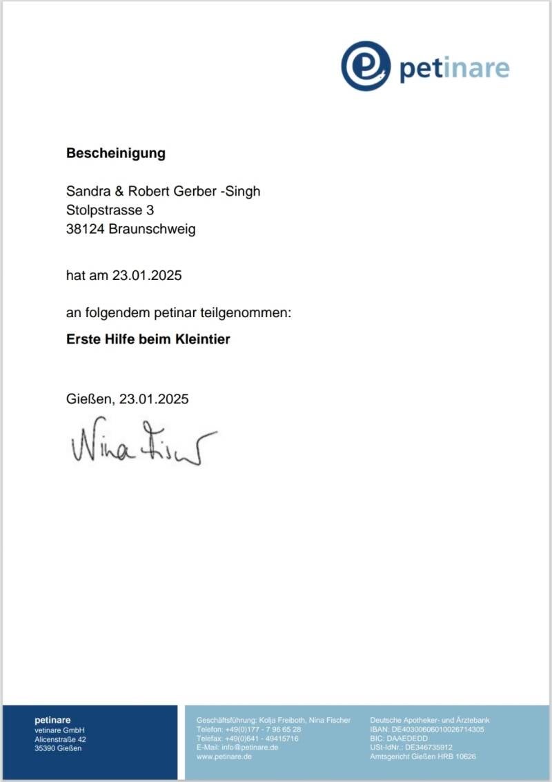 Durch unsere Ausbildung und eigenständige Weiterbildungen können wir auch bei euren Lieblingen sehr gut Symtome/Krankheiten etc. erkennen sowie im Notfall handeln.